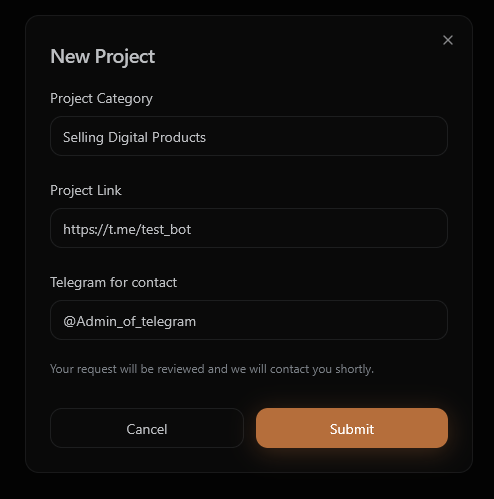- Enter your Telegram account for communication.