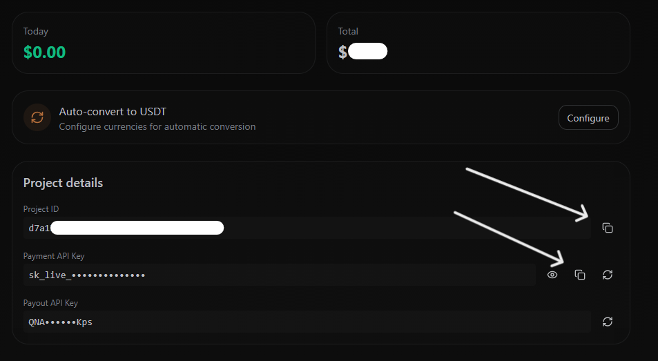 ● The one is «PAYOUT_API_KEY» - it is needed for payouts and is generated in the profile settings.