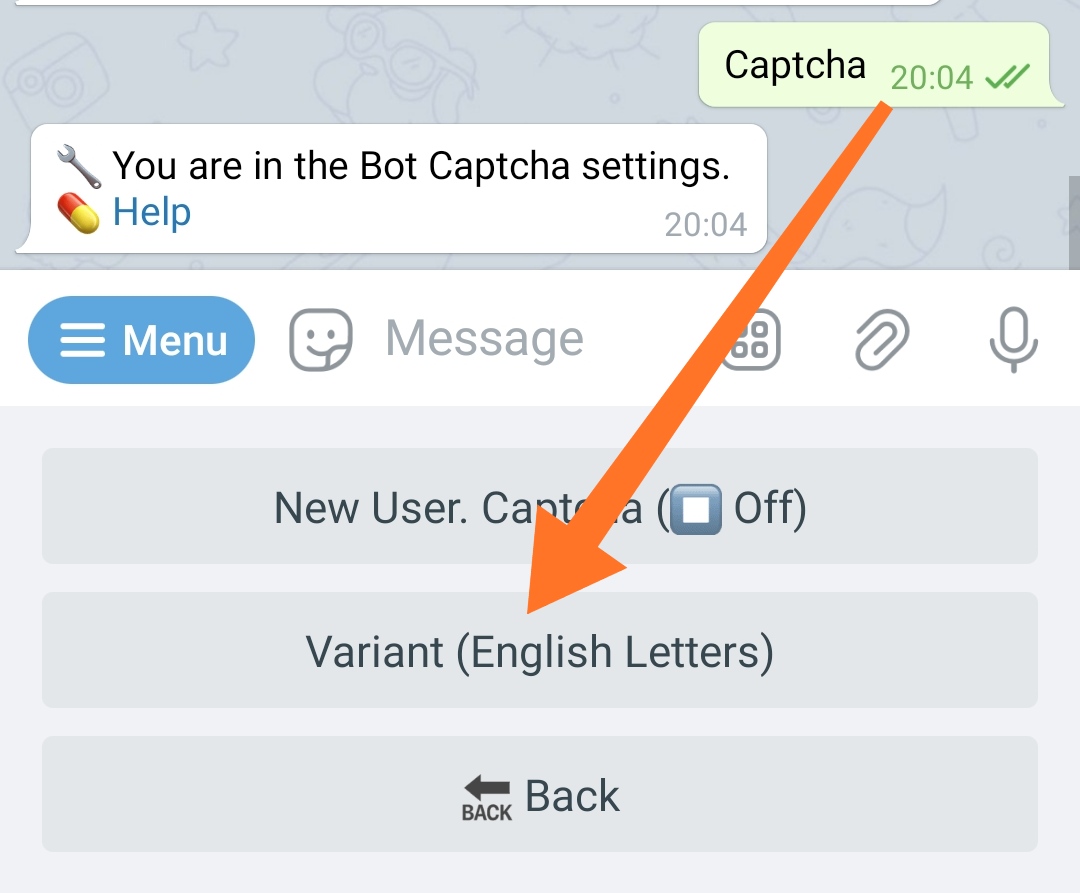 Captcha: a well-known tool for protecting your bot from robots, and administrators from spam. In @MenuBuilderBot - captcha can be used to check for new users and for the protection of the individual menu items.